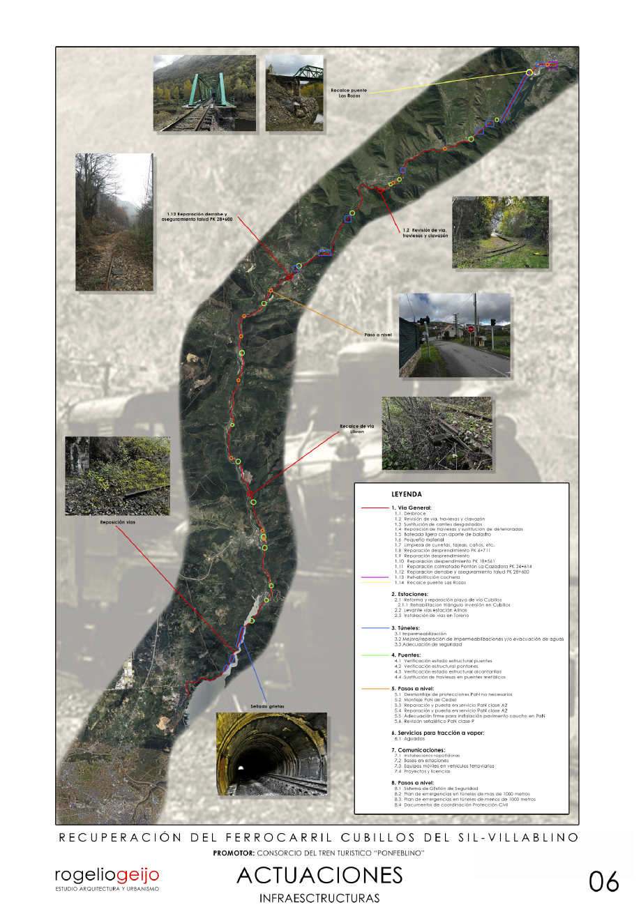 Nuestro objetivo es dejar la vía en condiciones óptimas y de seguridad para que el tren vuelva a correr por ella. Se intervendrá, especialmente, en los puntos más conflictivos en los que ha habido derrumbes y/o desprendimientos, como es el caso de la parte de trazado ferroviario a la altura de la carretera de Librán (Toreno), donde habrá que hacer una escollera. También se rehabilitarán e iluminarán los doce túneles y las pasarelas.